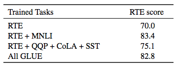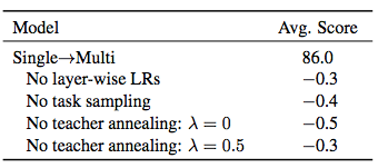 训练细节:研究人员并没有简单地对多任务模型的数据集进行 shuffle,而是遵循 Bowman 等人(2018 年)的任务抽样流程。这保证了超大数据集任务不会过度主导训练。研究人员还采用 Howard 和 Ruder(2018 年)的层级学习率技巧。
