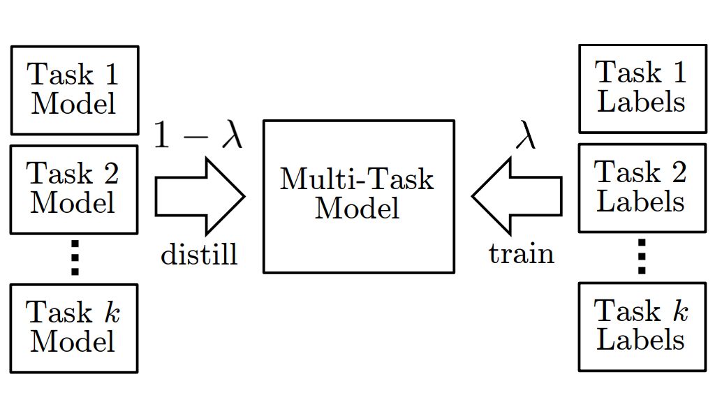 知识蒸馏即将知识从「教师」模型迁移到「学生」模型,执行方式为训练学生模型模仿教师模型的预测。在「born-again network」(Furlanello et al., 2018) 中,教师和学生具备同样的神经网络架构和模型大小,然而令人惊讶的是,学生网络的性能超越了教师网络。该研究将这一想法扩展到多任务模型训练环境中。
