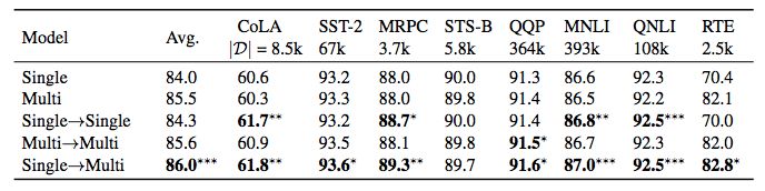 表 1:在 GLUE 开发集上对比不同方法。根据 bootstrap hypothesis test,∗、∗∗ 和 ∗∗∗ 表明单任务和多任务模型都有显著改善(分别是 p < .05、p < .01 和 p < .001)。