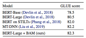 如下所示为目前 GLUE 基准的排名,Jacob 等人提出的原版 BERT 引发了一系列后续研究与改进,其中 BERT+BAM 的模型就是本文介绍的方法。