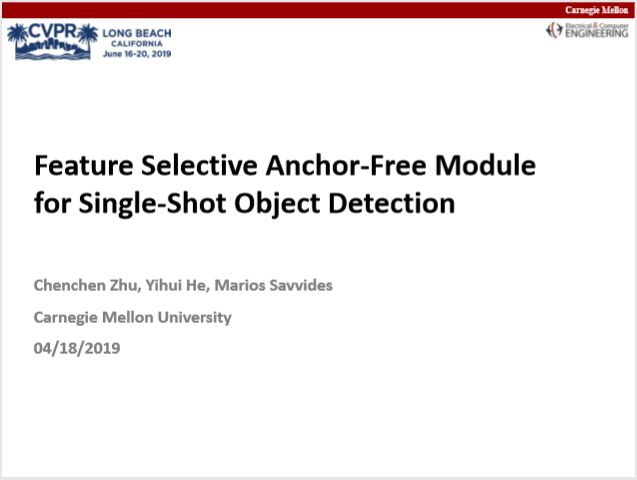 4月18日晚21:00,我们邀请了CMU(卡内基梅隆大学)的博士生诸宸辰,为我们分享了其在CVPR2019的工作:基于Anchor-free特征选择模块的单阶目标检测,在公众号回复“40”或者“诸宸辰”即可获取PPT和回放视频下载链接。