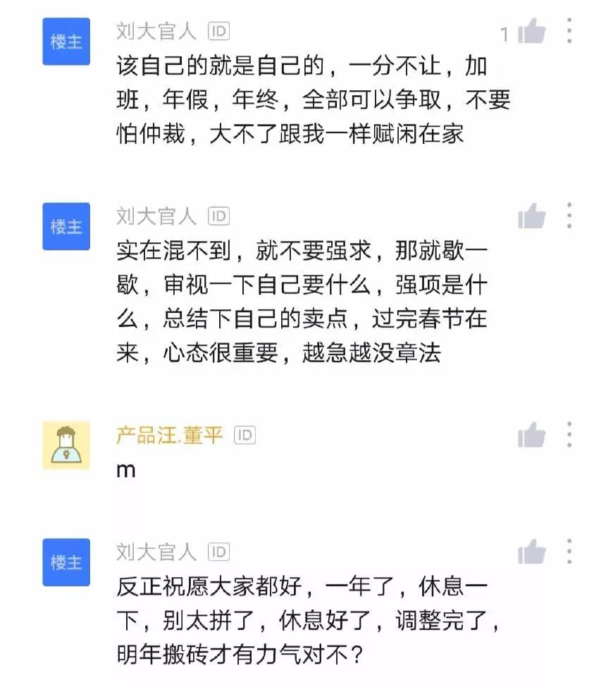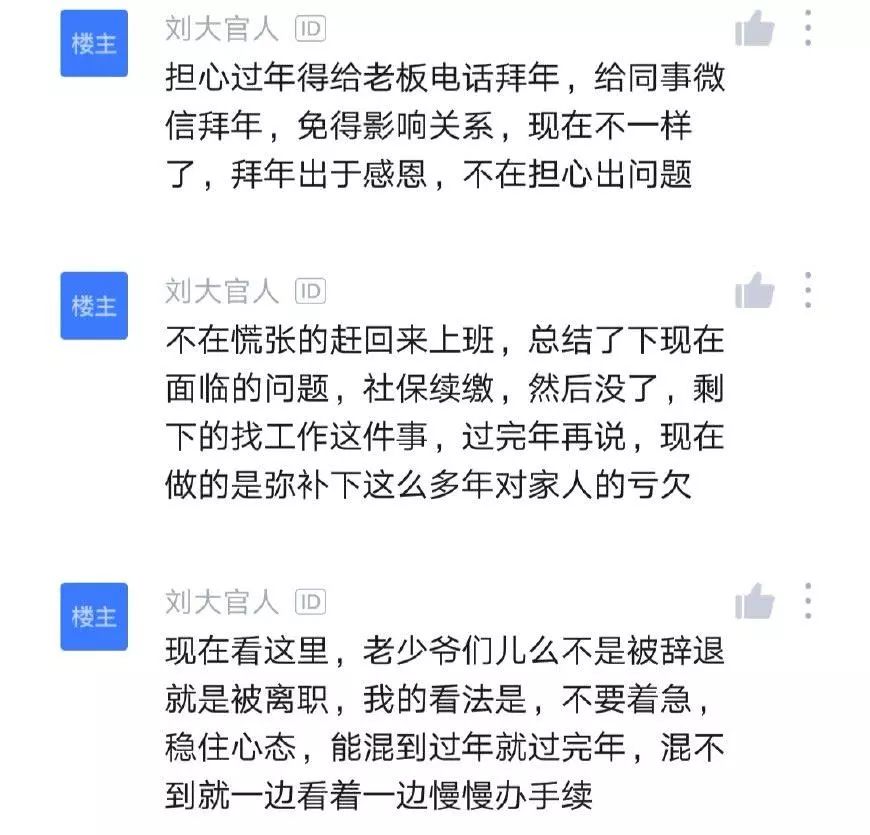 担心过年得给老板电话拜年,给同事微信拜年,免得影响关系,现在不一样了,拜年出于感恩,不在担心出问题,不在慌张的赶回来上班,总结了下现在面临的问题,社保续缴,然后没了,剩下的找工作这件事,过完年再说,现在做的是弥补下这么多年对家人的亏欠。现在看这里,老少爷们儿么不是被辞退就是被离职,我的看法是,不要着急,稳住心态,能混到过年就过完年,混不到就一边看着一边慢慢办手续,该自己的就是自己的,一分不让,加班,年假,年终,全部可以争取,不要怕仲裁,大不了跟我一样赋闲在家。