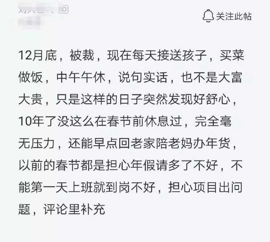 一名程序员在年前被裁员了,也许是塞翁失马,焉知祸福,借着这段被裁员的日子,这名程序员索性开始放松享受生活:12月底被裁,现在每天接送孩子买菜做饭,中午午休,说句实话也不是大富大贵,只是这样的日子突然发现好舒心,十年了没这么在春节前休息过,完全毫无压力,还能早点回老家陪老妈办年货,以前的春节都是担心年假请多了不好,不能第一天上班就到岗不好,担心项目出问题。