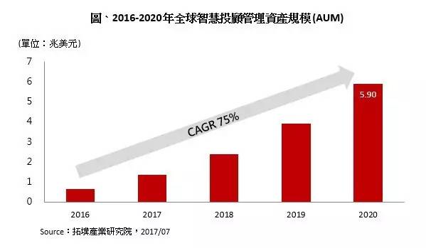 人工智能快速发展对于各行业带来巨大变革,仰赖大量数据与密集人力的金融服务业,被视为影响最为剧烈的行业,根据 TrendForce 旗下拓墣产业研究院调查指出,人工智能于金融服务业的应用,将以智能投顾发展最为快速,预估至 2020 年全球智能投顾的资产管理规模将达 5.9 万亿美元,年复合成长率为 75%。