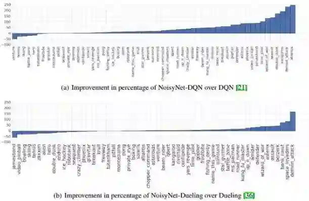本文提出了NoisyNet,一种权重中增加了参数噪声的深度强化学习智能体,也证明了这种智能体策略的诱导随机性可被用来辅助有效探索。在NoisyNet中,噪声参数随着剩余网络权重一起学习梯度下降。