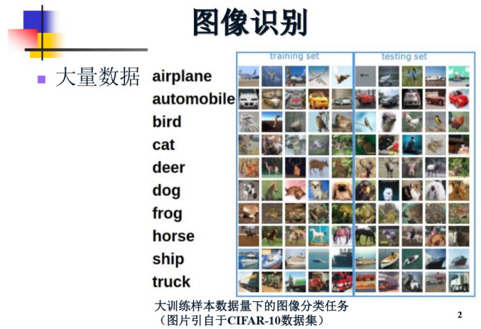 现在做图像识别,要求有大量的数据。什么叫大量的数据?比如上图是在业界做图像识别的数据集,包含很多类别的图像,像飞机、鸟、猫、鹿、狗。对于一个物体,需要有不同的表现,需要有不同的外观在不同的环境下的表现,所以我们需要很多照片素材。