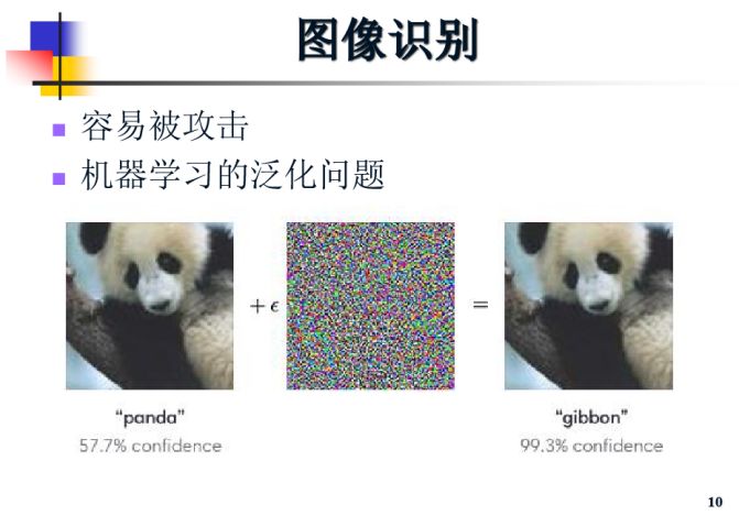 除此之外,我们发现深度学习模型很容易被攻击。如上图左边是一只熊猫,我们已经训练好网络能够识别出这是一只熊猫。如果我在这张图像上加了一点点噪声,这个噪声在右图你几乎看不出来,我再把这个叠加后的图像给网络,它识别出来的不是熊猫,是别的东西。而且它以99.3%的信心说这不是熊猫,甚至你可以指定他是任何一个东西。这件事情的风险在什么地方?如果只是娱乐一下,也没什么大关系。但是如果把它用于军事或者金融后果就比较严重了。因此我们一直在关心这个问题怎么解决,就是希望算法能够抗攻击性强一点,但目前只是缓解而没有彻底解决。