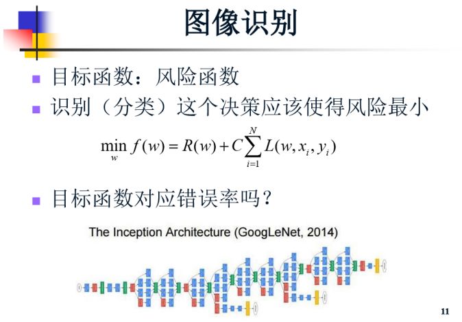 我们再说风险,图像识别中我们会把一个学习问题往往形式化一个优化问题,然后去优化这个函数,使这个函数最小。我们把这个函数叫做目标函数。有的时候我们会把这样的函数叫做损失函数,物体识别有错就带来损失。就是说在整个过程我们希望不要有太多的损失。其实,风险函数可能是更合适的词。因为你识别错了,其实是有风险的。一般来说目标函数对应于错误率,把狗识别成猫错了一张,把猫识别成狗又错了一张,都影响错误率,而错误率足以反映算法的性能。