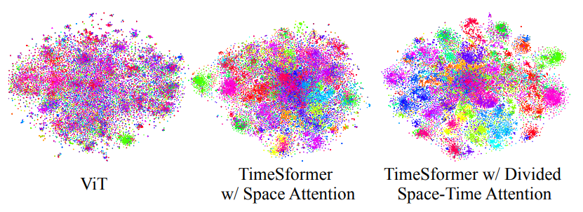 「每个视频都可视化为一个点。属于同一动作类别的视频具有相同的颜色。具有分割时空注意力的 TimeSformer 比具有仅空间注意力或 ViT 的 TimeSformer 在语义上学习更多可分离的特征。」
