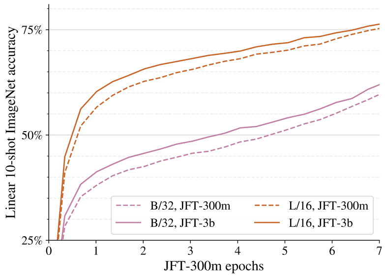 上图描绘了从 300M 图像数据集 (JFT-300M) 切换到 30 亿图像 (JFT-3B) 而不进行任何进一步缩放的效果。中型 (B/32) 和大型 (L/16) 模型都受益于添加数据,大致是一个常数因子。结果是在整个训练过程中通过小样本(线性)评估获得的。