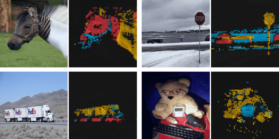 此属性也出现在自监督预训练的卷积神经网络中,但需要一种特殊的方法来可视化特征。更重要的是,自注意力头学习补充信息并通过为每个头部使用不同的颜色来说明。默认情况下,这根本不是通过自注意力获得的。