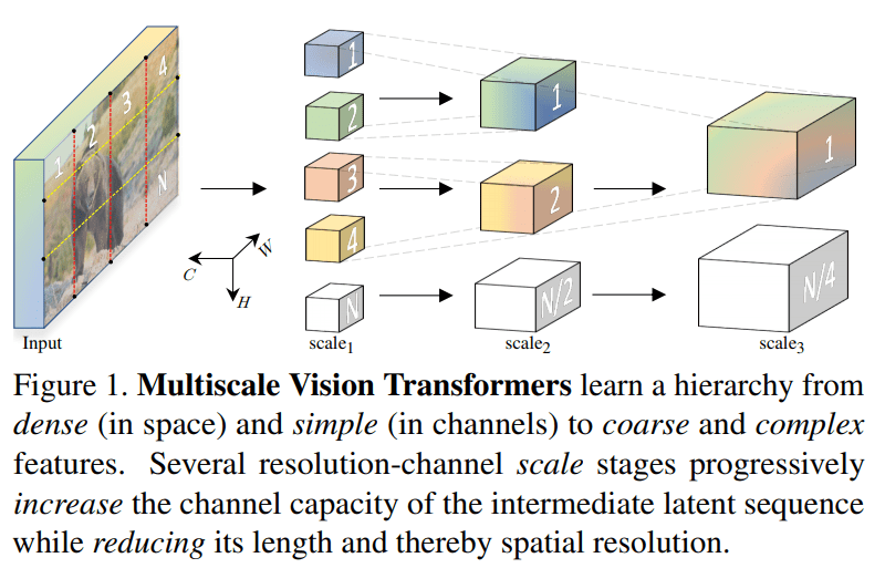 CNN 主干架构受益于通道的逐渐增加,同时降低了特征图的空间维度。类似地,多尺度视觉 Transformer (MViT) 利用了将多尺度特征层次结构与视觉 Transformer 模型相结合的想法。在实践中,作者从 3 个通道的初始图像大小开始,逐渐扩展(分层)通道容量,同时降低空间分辨率。