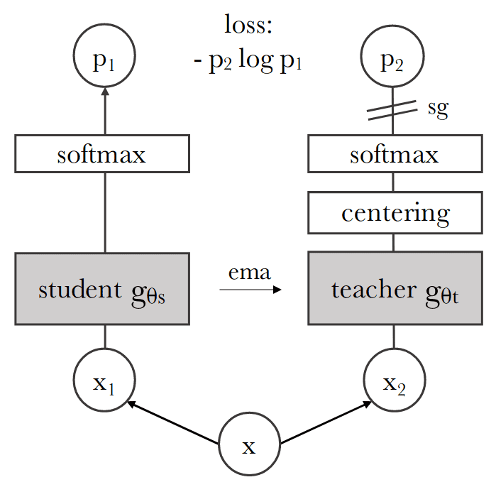 与其他自监督模型相比,他们使用了交叉熵损失,就像在典型的自蒸馏场景中所做的那样。尽管如此,这里的教师模型是随机初始化的,其参数是根据学生参数的指数移动平均值更新的。为了让它 work,研究者将带温度参数的 softmax 应用于具有不同温度的教师和学生模型。具体来说,教师模型得到的温度参数更小,这意味着更敏锐的预测。最重要的是,他们使用了从 SWAV 中获得的多重裁剪方法,效果更佳,在这种情况下教师只能看到全局视图,而学生可以访问转换后的输入图像的全局和局部视图。