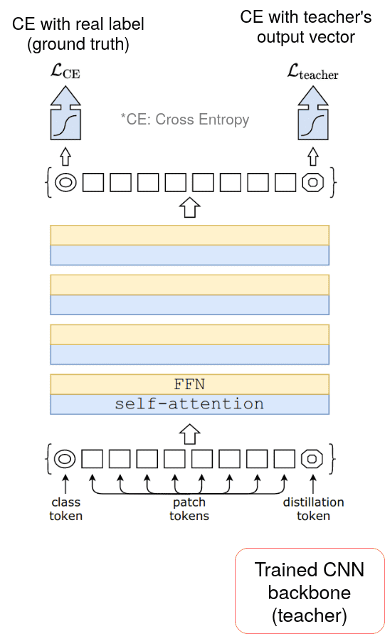 在这种方法中,一个额外的可学习全局 token(即蒸馏 token),与 ViT 的 patch 嵌入相连。最关键的是,蒸馏 token 来自训练有素的教师 CNN 主干网络。通过将 CNN 特征融合到 Transformer 的自注意力层中,研究者们在 Imagenet 的 1M 数据上训练 DeiT。