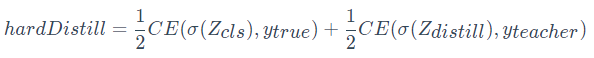 其中 CE 是交叉熵损失函数,σ 是 softmax 函数。Z_cls 和 Z_distill 分别是来自类 token 和蒸馏 token 的学生模型的输出,ytrue 和 yteacher 分别是 ground truth 和教师模型的输出。