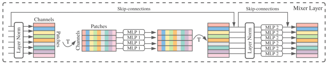 MLP-Mixer 包含两个 MLP 层:第一个独立应用于图像 patch(即「混合」每个位置的特征),另一个跨 patch(即「混合」空间信息)。