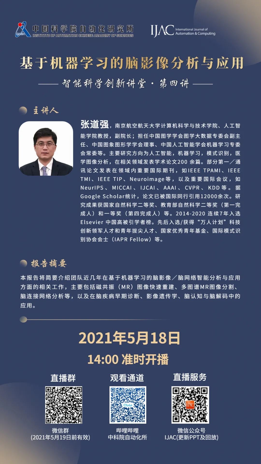创新讲堂第四讲邀请到IJAC优秀作者、南京航空航天大学张道强教授带来"基于机器学习的脑影像分析与应用"的报告。2021年5月18日(周二)14点,五月学术盛宴,诚邀您出席!