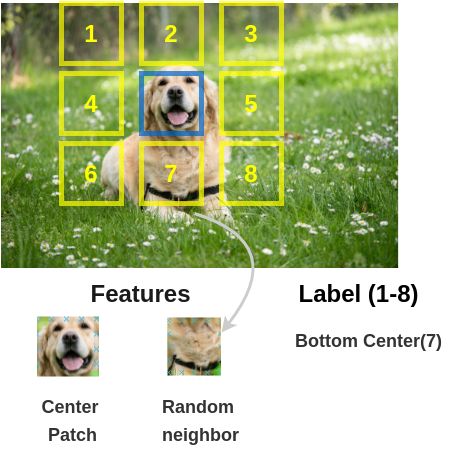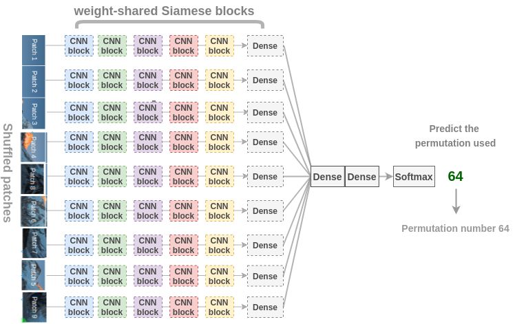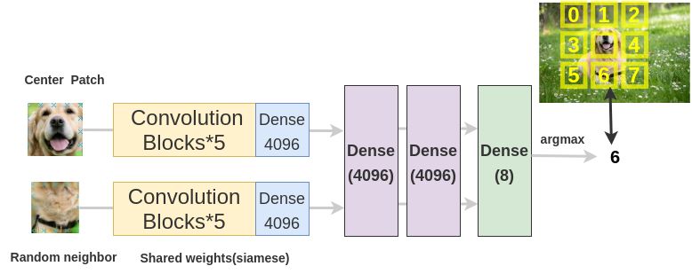 为了解决这个文本前的任务,Doersch等人使用了类似于拼图游戏的架构。我们通过两个siamese卷积神经网络传递图像块来提取特征,连接特征并对8个类进行分类,表示8个可能的邻居位置。