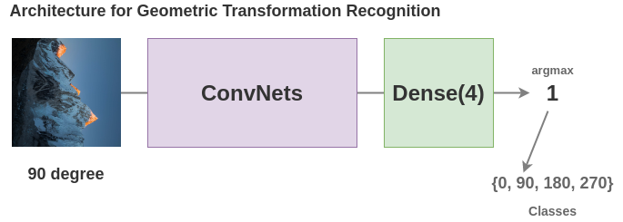 为了解决这个文本前的任务,Gidaris et al.提出了一种架构,其中旋转后的图像通过一个卷积神经网络,网络需要把它分成4类(0/90/270/360度)。
