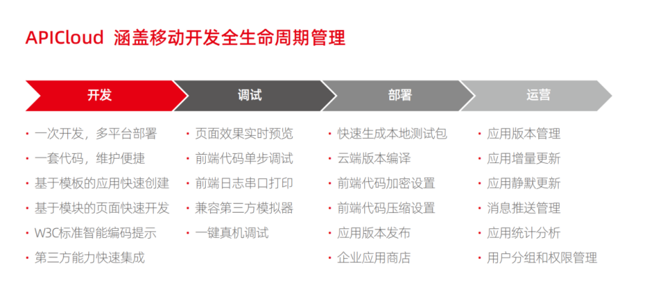 值得一提的是,YonBuilder 移动开发平台的重要组成部分 APICloud,是国内低代码开发平台的引领者与效率革命的探索者,基于对云原生、BizDevOps、混合开发等能力的持续集成,聚合了国内主流 PaaS 和 SaaS 服务,提供 1400+ 成熟功能模块,如今已经完成了从移动开发向低代码开发平台的演进,形成了坚实的生态壁垒和先进的敏捷开发能力,可以使应用的开发周期从 6 个月缩短至 2 个月。