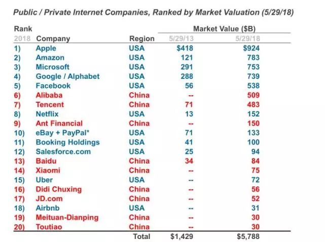 报告指出,中国正在成为全球最大的互联网公司的中心。截至5月29日,全球20个市值或估值最大的互联网公司中,中国占据了9家,美国有11家,5年前,中国只有2家,美国有9家。中国在全球互联网中的地位与美国的差距正在进一步缩小。
