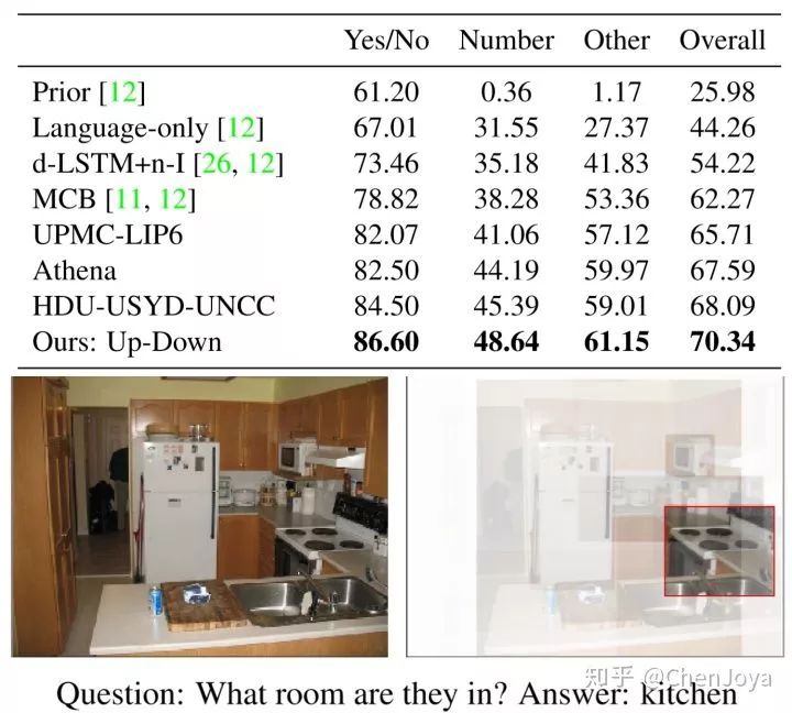 两者结合后的模型称为 Up-Down,以下提供了在 VQA v2.0 上的评测结果,为提交时最高: