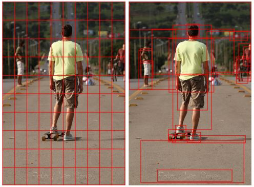 VQA 2017 Challenge 的冠军模型体现在这两篇文章中,我们放在一起介绍。CVPR'18 这一篇是方法论,Tips and Tricks 算是工程实现方面的报告。在方法论中,主打的就是 top-down 和 bottom-up 和两种 attention 机制:前者是指的人会被视觉中的显著突出物体给吸引,是由图像这种底层信息到上层语义的;而后者指的是人在进行某项任务的时候,紧密关注和该任务相关的部分,是由上游任务去关注到图像的。一般的注意力机制就像下图中的左侧显示的那样,是自上而下(top-down)的,表现在依据任务为这些 grid cell 去分配不同的权重,而右侧的注意力机制是自下而上的,从物体层面(object-level)去注意到显著性区域: