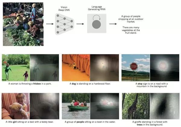 类比于将法语句子的意思翻译成英语句子,同样可以学习将图片内容“翻译”为英语句子(如图3)。这种编码器是可以在最后的隐层将像素转换为活动向量的深度卷积网络(ConvNet)。解码器与RNNs用于机器翻译和神经网络语言模型的类似。近来,已经掀起了一股深度学习的巨大兴趣热潮(参见文献[86]提到的例子)。