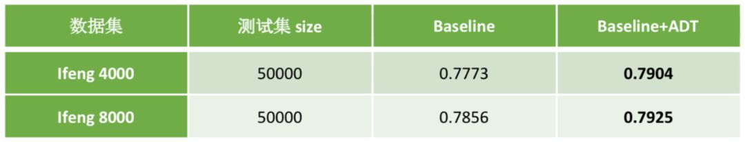 上表中,Baseline 为现有的分类模型,Baseline+ADT 指的是在现有分类模型的基础上加上对抗训练之后的模型,实验对比指标为分类精度。如上表所示在加入对抗训练后在不同测试集上均有不同程度的提升,其中在小数据集(Ifeng 4000)上提升相对更明显。