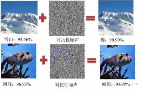 ▲ 图1. 简单的对抗攻击示列(图片来自https://zhuanlan.zhihu.com/p/37260275)