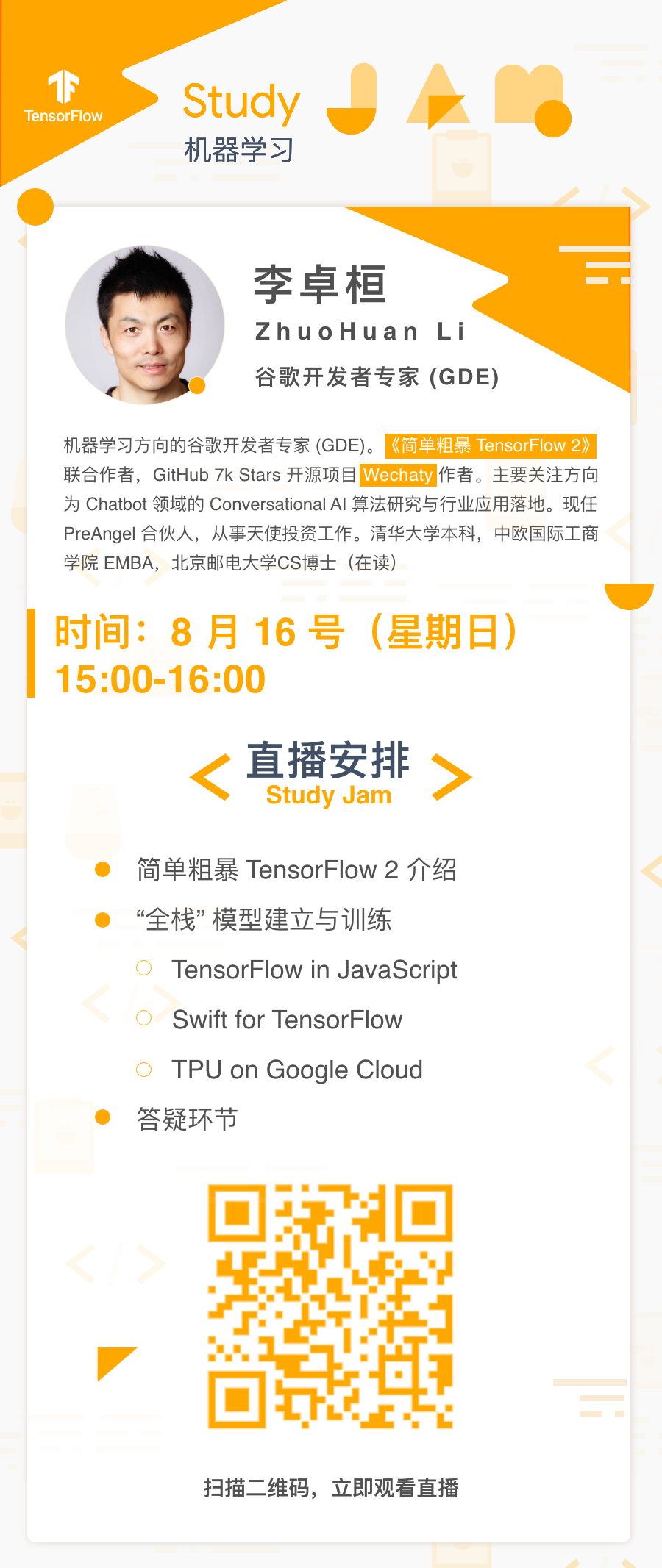 正如上文所说,本周日下午,老师会从 TensorFlow in JavaScript、Swift for TensorFlow 和 TPU on Google Cloud 三个方面进行分享,进一步拓展大家对 TensorFlow 多语言部署和移动端应用趋势的认知。