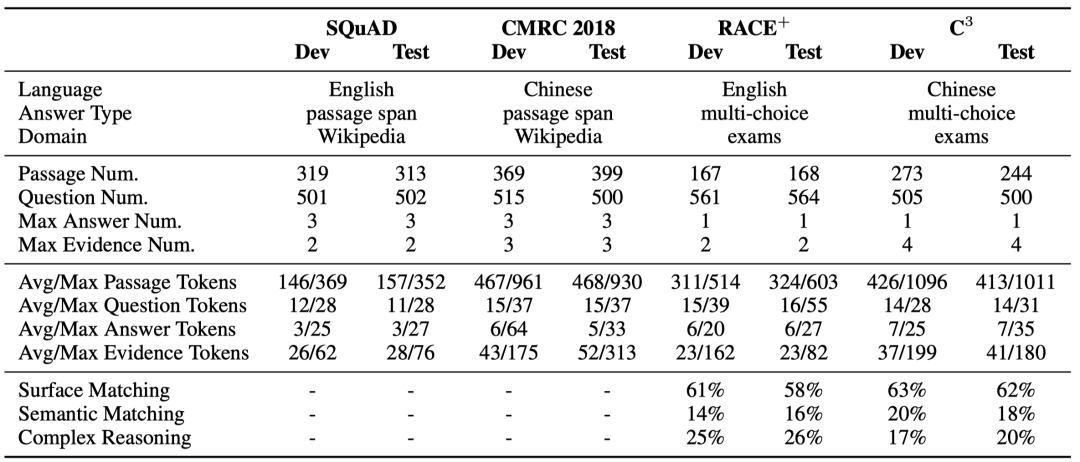 ExpMRC数据集的相关统计信息如下。需要注意的是,ExpMRC并不包含有标注的训练集。这样设计的目的是促使研究人员利用现有的数据(例如SQuAD)来同时完成答案输出和证据输出,而不需要利用额外的有证据标注的训练集。