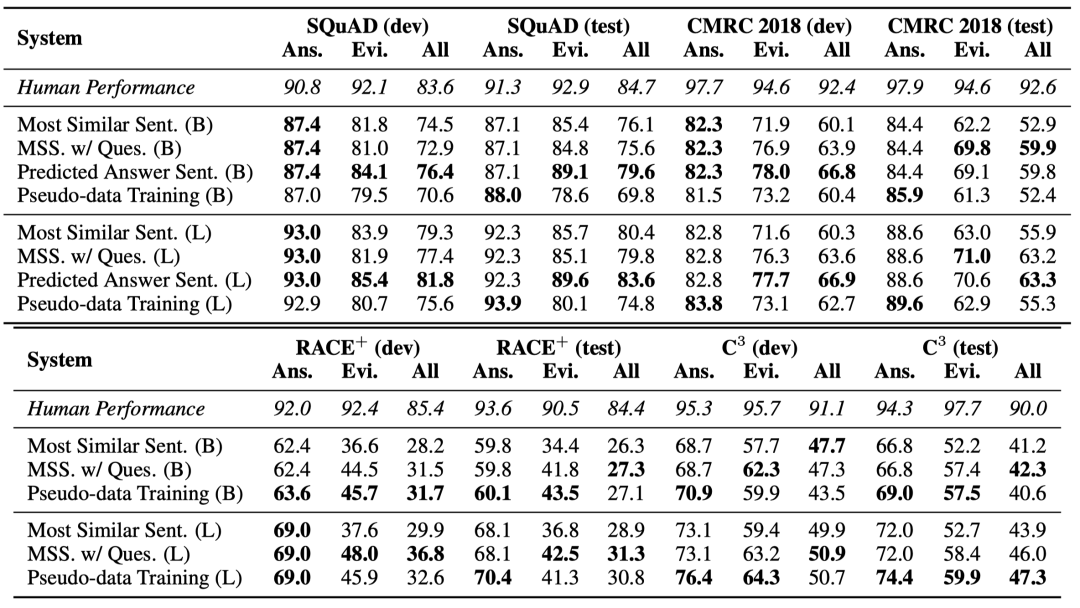 对于选择型阅读理解,不论是答案准确率还是证据精度都要显著低于篇章片段抽取型阅读理解数据集的效果。说明抽取型阅读理解数据集的难度相对较低,而且证据通常是与答案重叠度比较高的句子或片段。
