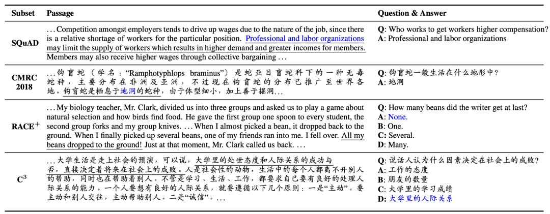 C3:同样是选择型阅读理解数据集(中文)。需要注意的是,这里我们只使用了非对话型子集C3(M)。