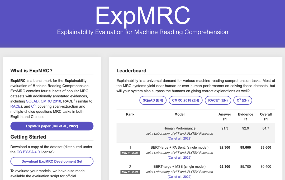 Yiming Cui, Ting Liu, Wanxiang Che, Zhigang Chen, Shijin Wang. ExpMRC: Explainability Evaluation for Machine Reading Comprehension[J]. 2022. Heliyon 8, e09290. Cell Press. doi: 10.1016/j.heliyon.2022.e09290