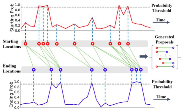 要生成候选时序动作提名,首先我们选择动作开始和动作结束概率序列中满足以下两个条件之一的时间节点作为候选时序边界节点:(1)概率高于一个阈值 或(2)该时间节点的概率高于前一时刻以及后一时刻的概率。然后我们将候选开始时间节点和候选结束时间节点两两结合,保留时长符合要求的开始节点-结束节点组合作为候选时序动作提名。算法示意图如下图所示。