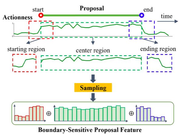 接下来要为每个候选时序动作提名生成对应的特征描述,我们称其为Boundary-Sensitive Proposal (BSP) feature。对于每个提名,我们取其本身的时序区间作为center region,再取开始节点和结束节点附近的一段区间作为starting region 以及 ending region。对于每个区域,我们都在动作概率序列上的对应位置采样N个点,拼接后则得到一个非常简短的提名特征。BSP特征的构成示意图如下图所示。