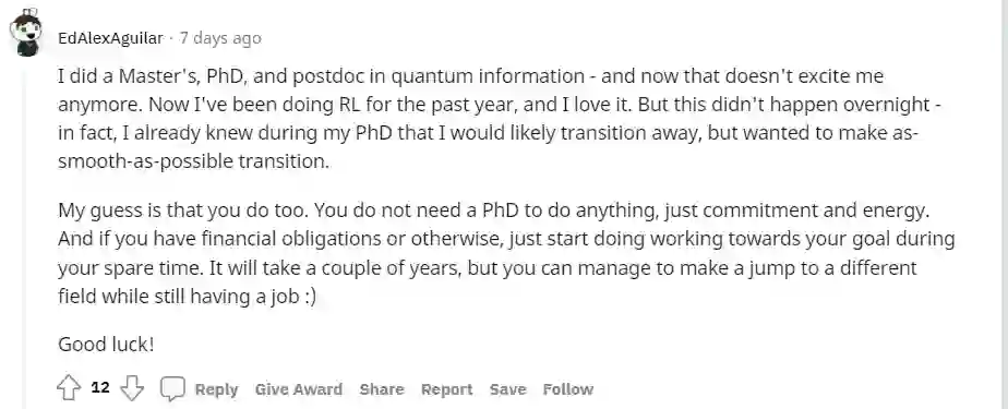 网友EdAlexAguilar分享说,我在量子信息领域读了硕士、博士和博士后,但现在这个领域的研究已经不能让我兴奋了。我在过去的一年里一直在做强化学习,我很喜欢这个新领域。但这并不是一夜之间发生的,事实上,我在读博士期间就已经知道我很可能会转型离开,但希望能尽可能顺利地过渡。我的猜测是,你也是如此。你不需要一个博士学位,只需要额外的精力来学习。如果你有财务压力的话,就在业余时间开始为新目标奋斗。这可能需要几年的时间,但你可以设法在有工作的情况下跳到不同的领域。
