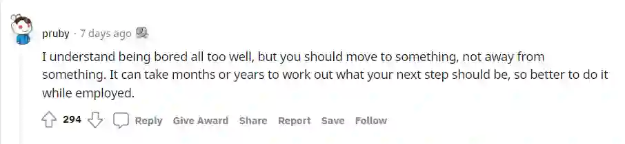 网友pruby表示,我太懂这种无聊的感觉了,但你应该换一个工作方向,而不是离开。思考下一步的方向可能需要几个月或几年才能彻底确定下来,所以最好不要「裸辞」。
