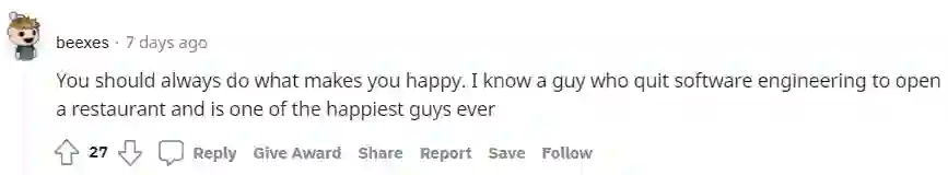 网友beexes表示,你应该永远只做让你感觉快乐的事。我有一个朋友,他就不干软件工程师了,转头开了一个餐馆,他现在应该是世界上最快乐的人了。