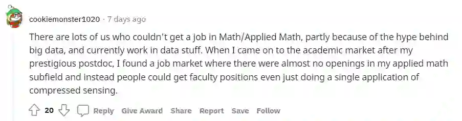 网友cookiemonster1020表示,在数学/应用数学领域找不到工作的部分原因是大数据背后的炒作。当我在著名的大学做博士后毕业以后,进入学术市场时,我发现在我所在的应用数学子领域几乎没有空缺位置;相反人们即使只是做一个压缩传感的应用,也能得到教职。