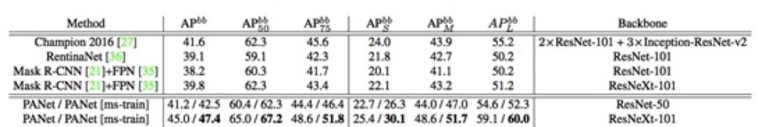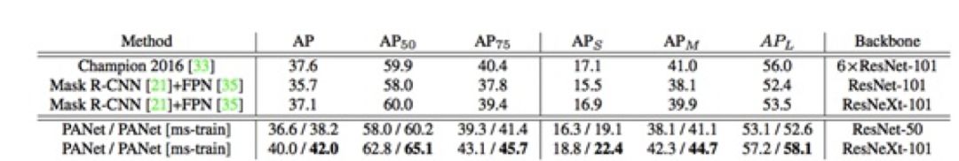 PANet 在 COCO 上的结果图,其中上侧为分割的结果对比表,下侧为检测的结果对比表