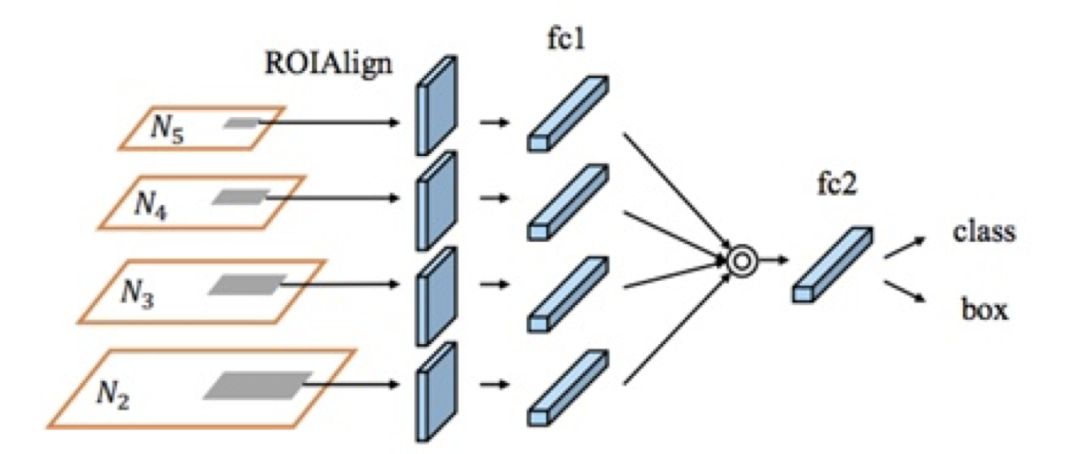 将每个候选区域映射到不同的特征层次,用 RoIAlign 池化不同层次的特征网格,进一步融合不同层次的特征网格(逐像素求最大或者求和)。