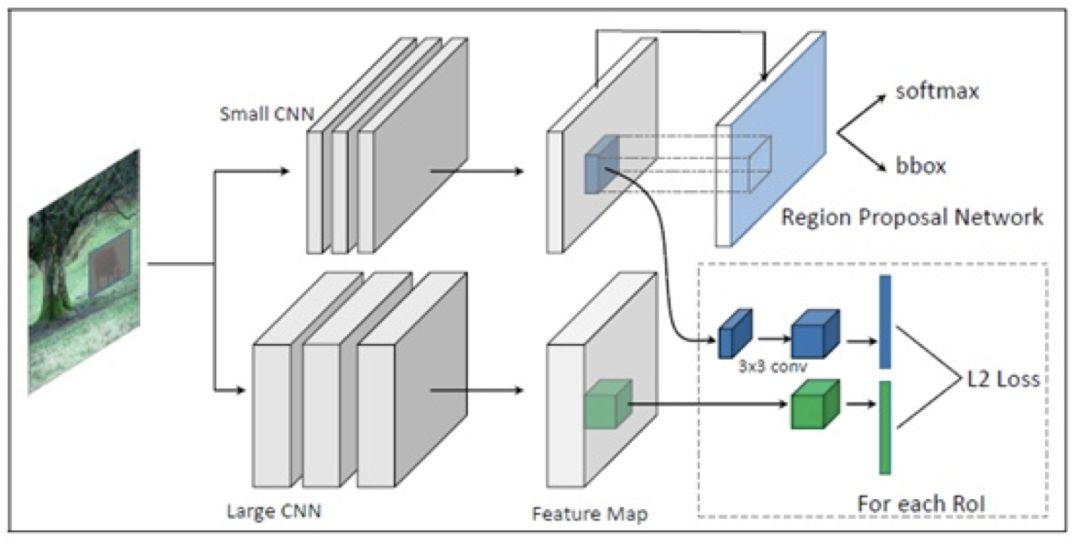 上图示意了训练时的网络结构,上半部分是要训练的目标网络,通常是一个精简的小网络,后面加上 RPN 网络;下半部分是大网络,大网络用已经训练好的大检测网络模型进行参数初始化。论文将训练过程中的监督信息分成两部分:来自大网络的监督信息 mimic supervision 和训练数据的标注信息 ground-truth supervision。