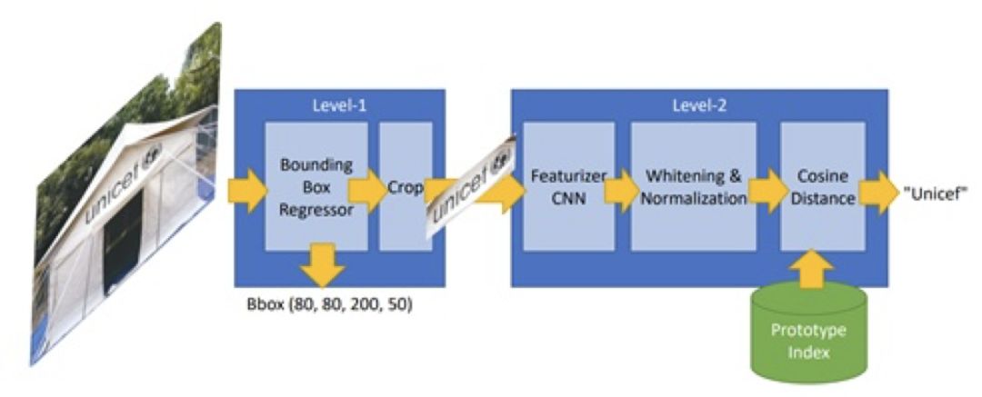 论文旨在解决对 logo 的检测问题。作者将 e2e 的检测模型分为两步,1. 使用 Single Shot Multibox Detector(文中使用 YOLO v2)检测可能的 logo 位置;2. 使用Triplet Loss训练的 deep image-similarity network 模型对 logo 进行检索。