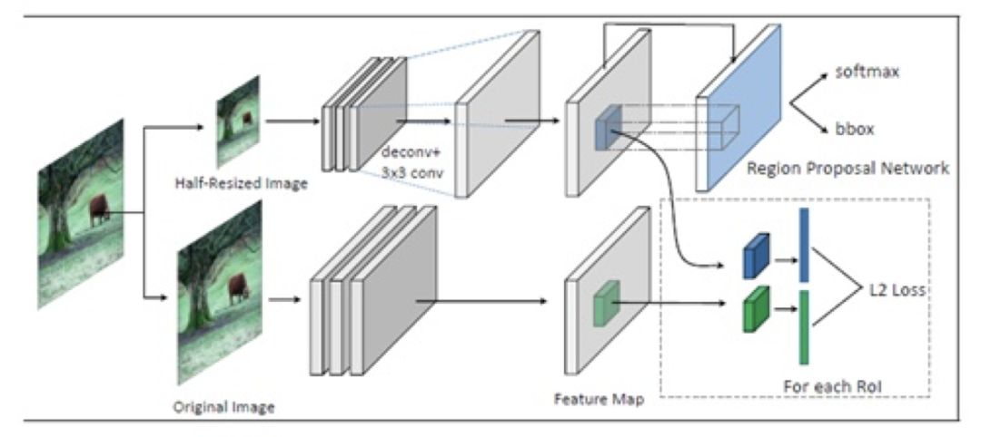 以上介绍了大网络到小网络的特征提取和检测能力迁移。除此以外,本论文思想还可用于接受大分别率输入图像的网络的检测能力迁移至小分辨率输入图像的网络,提升小分辨率输入图像的检测效果。如下图所示,基本思想即在最后一个 feature map 输出让 RPN 网络之前添加一个 decovolution 层增加 feature map 的分辨率,训练时使用支持大分辨率输入的网络进行监督。