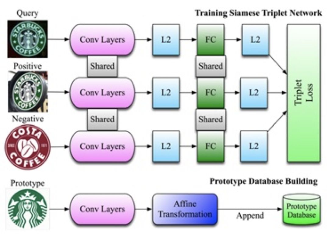 如上图所示,本文使用的网络为 2-layer 网络。Layer1 是 YOLOv2,通过识别 Logo 来提取框,然后 crop+resize 为 224*224。 作者提出使用 Single Shot Multibox Detector 而非 proposal-based 网络的原因为 logo 检测需要使用物体的全局信息。Layer2 是训练检索网络。训练为典型的 triplet loss 训练过程:使用两组相同 logo,一组不同 logo,通过缩小类内 loss、增大类间 loss 来促进收敛网络。Layer2 网络通过 CNN 提取特征然后经过 L2 归一化和 FC 层,最终提取 feature vector。检索数据集的准备过程在训练完成后进行,使用特定 logo 经过特征提取和仿射变换操作,制作数据集。最终使用 feature vector 的余弦距离来进行实例检索。