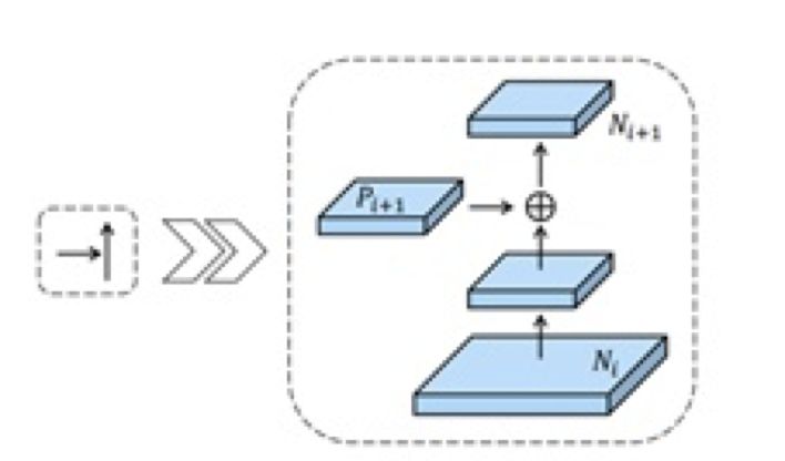 网络结构在 FPN{P2,P3,P4,P5}后接{N2,N3,N4,N5}(图 5 a,b 所示),其中 N2 就是 P2 没有经过任何操作。如图 6 所示,每个模块通过横向连接将较高分辨率的 Ni 和低分辨率的 Pi+1 横向连接,产生 Ni+1。