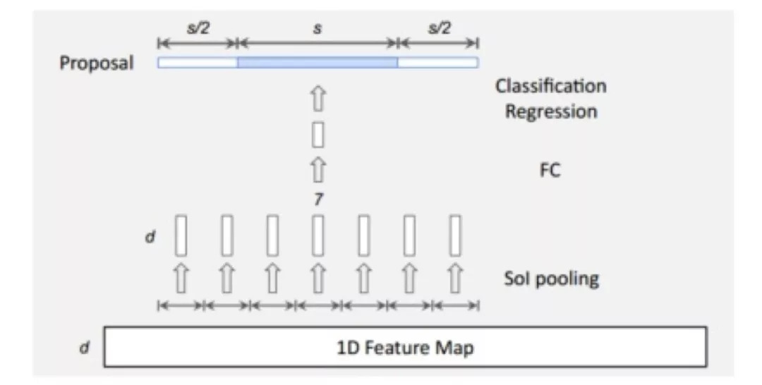 接着,对于每个候选片段,本论文计算动作类别的概率,并进一步对片段边界进行回归。在这一步,首先使用一维的 SoIPooling(时间维度上做 Pooling,类似空间维度的 RoIPooling),接着使用 DNN 分类器来实现。