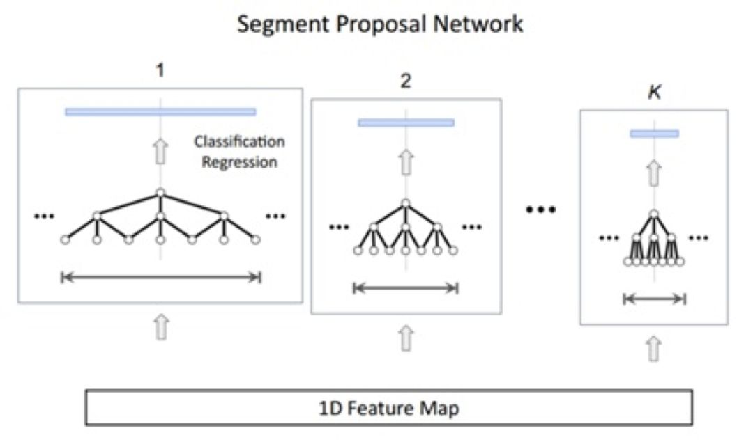 给定一组帧序列,通常通过二维或者三维卷积网络提取出一组一维特征图。之后,将该特征图传输给一维网络(类似 RPN 层,Segment Proposal Network),返回一组候选片段。